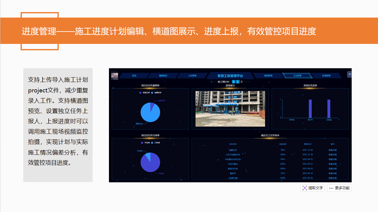 核心功能:施工计划制定(甘特图)、实际进度录入、进度偏差分析、关键路径预警、工程量统计;