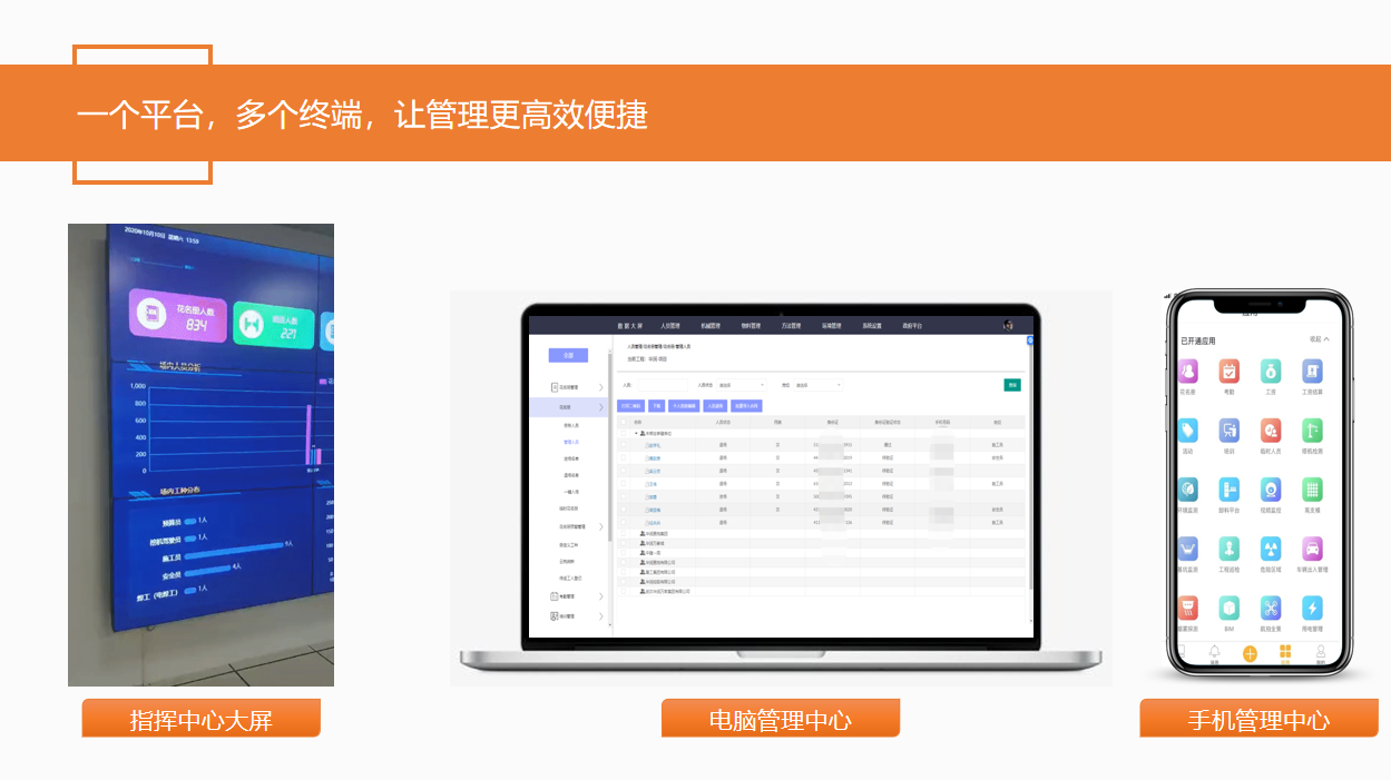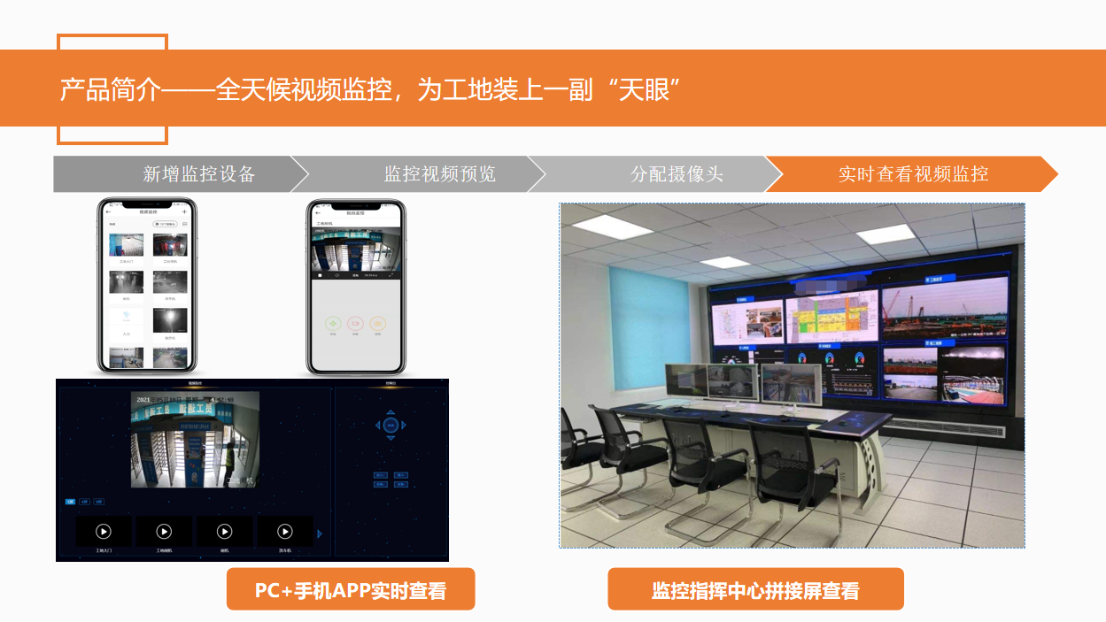 核心功能:整合所有模块数据,通过 LED 大屏或电脑端展示工地全景(视频拼接)、人员 / 设备分布、安全 / 环保指标、进度状态、预警信息等,支持远程指挥调度;