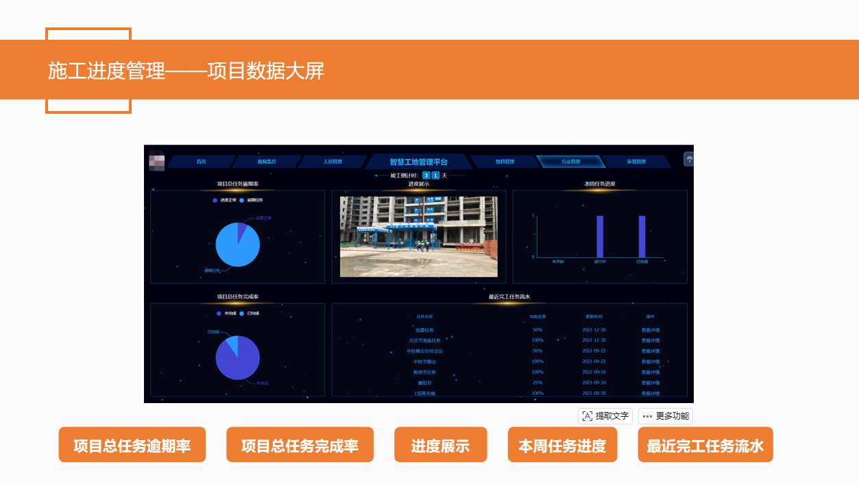 数据驱动决策:通过各类传感器、终端设备采集工地人、机、料、法、环等全要素数据,形成可视化数据看板,支撑管理人员实时决策;